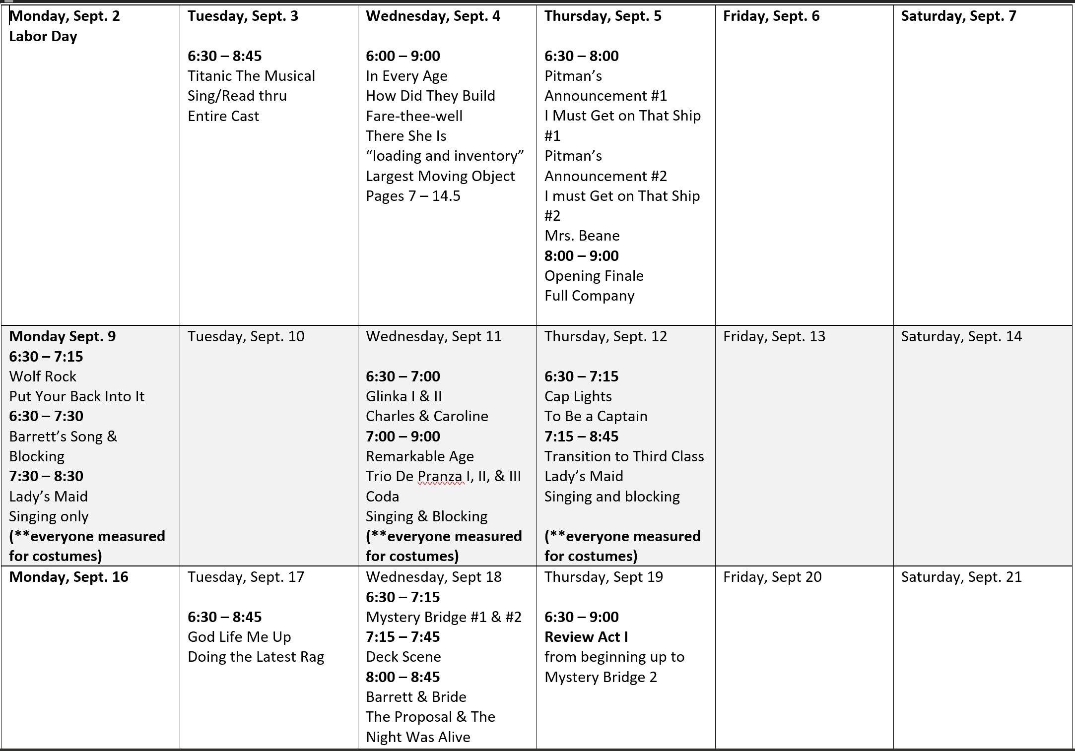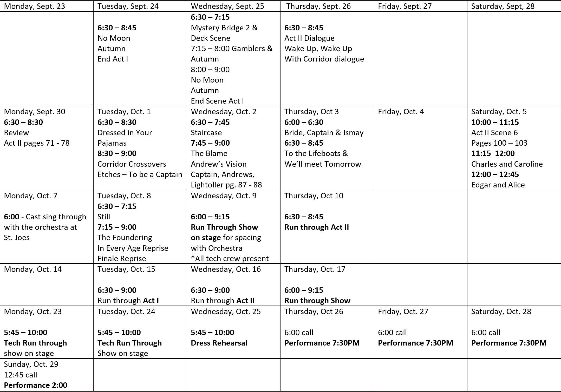 Congratulations to the cast of Titanic, the Musical: In Concert! We will see you on September 3rd at 6:00pm at Struthers Library Theatre for our read through! Thomas Andrews - Jordan Spencer J. Bruce Ismay - Kevin Hunt Captain E. J. Smith - John Shaughnesy 1st Officer, William Murdoch - Brandon Hinton 2nd Officer, Charles Lightoller - Nick Norrod 3rd Officer, Herbert Pitman - Allan Branthoover 4th Officer, Joseph Boxhall - Tristan Brumagin Quartermaster, Robert Hichens - James Pollard Harold Bride - Andrew Stalder Frederick Barrett - Andrew Pollard Fredrick Fleet - Kenny Anderson Chief Engineer, Joseph Bell - Ethan Monroe Henry Etches, Steward - John Beard Bellboy - Colin Drayer Bandmaster, Wallace Hartley - Logan Johnson Isidor Straus - Randy Baughman Ida Straus - Pat Pollard John J. Astor - Michael Stenberg Madeline Astor - Erica Evans Benjamin Guggenheim - Doug McCracken Mme. Aubert - Catherine Lyon Traveling companion to Mme. Aubert - Melissa Carr John B. Thayer - Sam Bailey Marion Thayer -Becky Yeager Jack Thayer- Sammy White George Widner - Corey Bailey Eleanor Widner - Deb Murphy Charlotte Cardoza - Lil Hunkele The Major - Jeff Ewing Edgar Beane - Gary Brumagin Alice Beane - Adrianne Laird-Hunt Charles Clark - Derek Hahn Caroline Neville - Kaitlyn McCracken Edith Corse Evans – Caitie Webster 2nd class Ensemble - Barb Boger, Georgie Rice, Erin Eastman-Sullivan, Collette Bonavita, Jen Bailey 2nd class Ensemble Youth - Jason Bonavita, Andrew Bailey, Caroline Smyth, Macy Winicki Kate McGowan - Ellen Paquette Kate Murphy - Kira Spencer Kate Mullins - Kelsey Angove Jim Farrell - Patrick Mulligan 3rd Class Ensemble - Barb Crowley, Dixie Brumagin, Kari Ewing, Angela Abreu, Natasha Button, Maddie Robbins, Lyndsey Dippold, Cindy Granger 3rd class Ensemble Youth - Brody Connolly, Chalina Abreu, Chevelle Yesky, Abiana Edwards, Natalie Baxter, Chloe Spencer, Scarlet Spencer Andrew Latimer - Adam McChesney Stewardess Robinson - Lynn Sears Stewardess Hutchinson - Megan VanOrd Stewardesses - Bethany Pascuzzi, Nyssa Brumagin, Riane Winslow, Sydney Ewing |