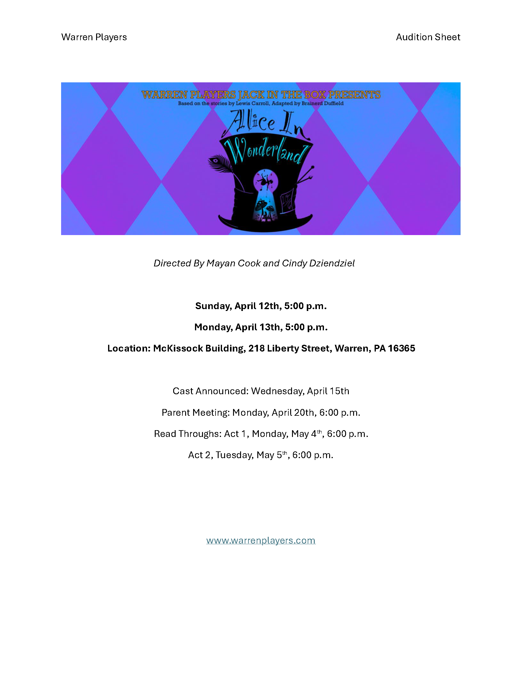 Auditions will be held at The McKissock Building (218 Liberty Street, Warren, PA 16365).